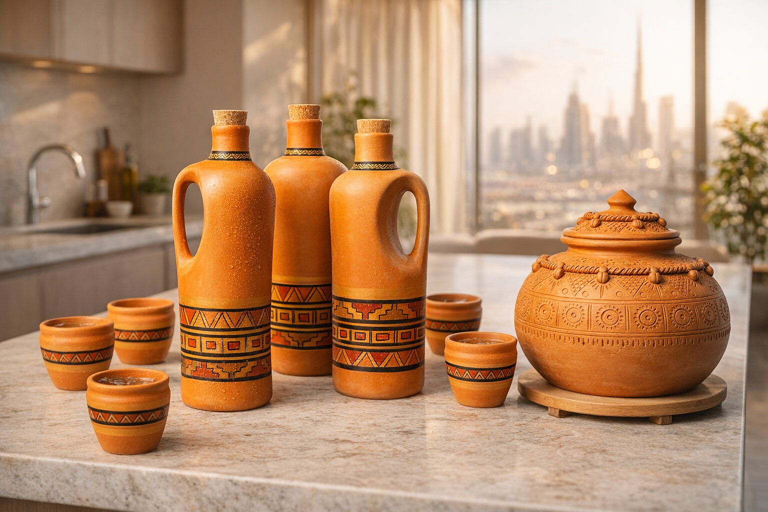 Layali Terracotta Water Set (6-Piece) – Bottle with Cork + 4 Cups + Serving Tray