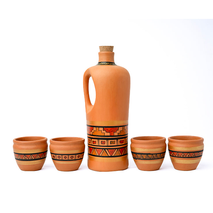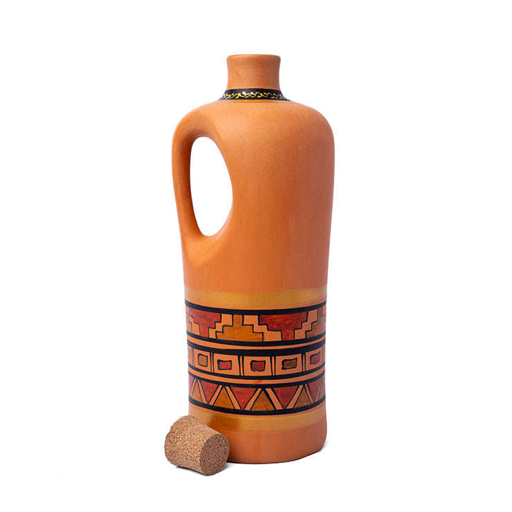 زجاجة مصنوعة يدوياً من الطين المحروق، تتميز بتبريد طبيعي، ومقبض سهل الإمساك، وسدادة من الفلين - مزينة بشريط هندسي مرسوم يدوياً لإضفاء مظهر ترابي فاخر.